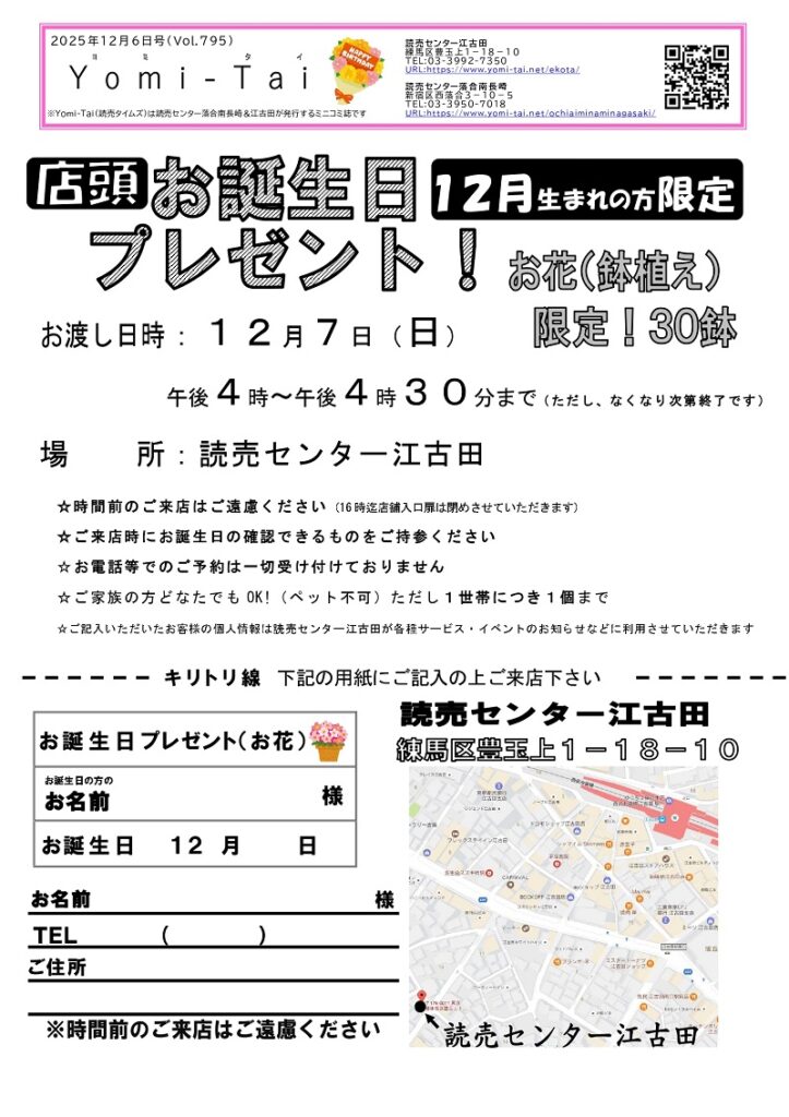 新聞のご購読のお申し込み・お問い合わせは、読売センター江古田へ