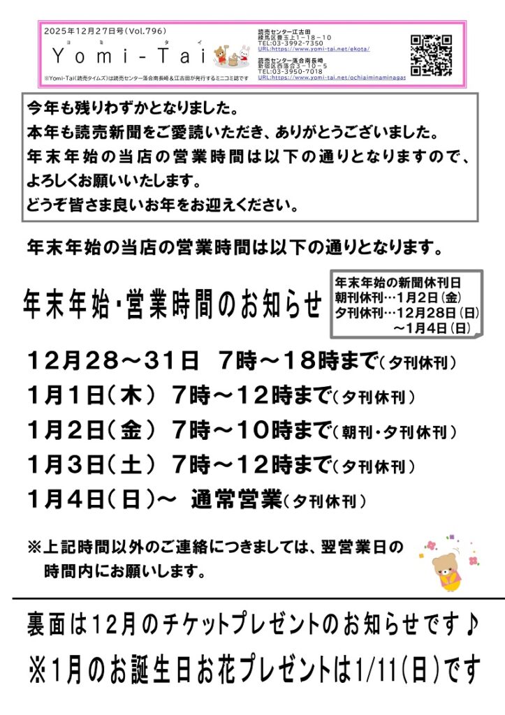 新聞のご購読のお申し込み・お問い合わせは、読売センター江古田へ