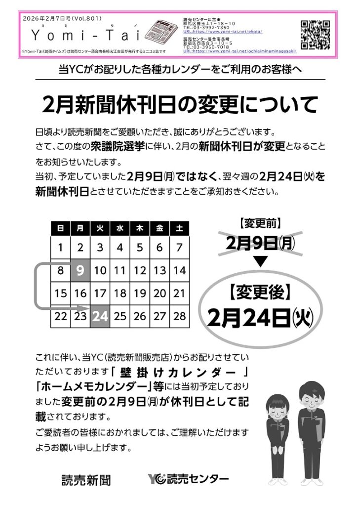 新聞のご購読のお申し込み・お問い合わせは、読売センター江古田へ