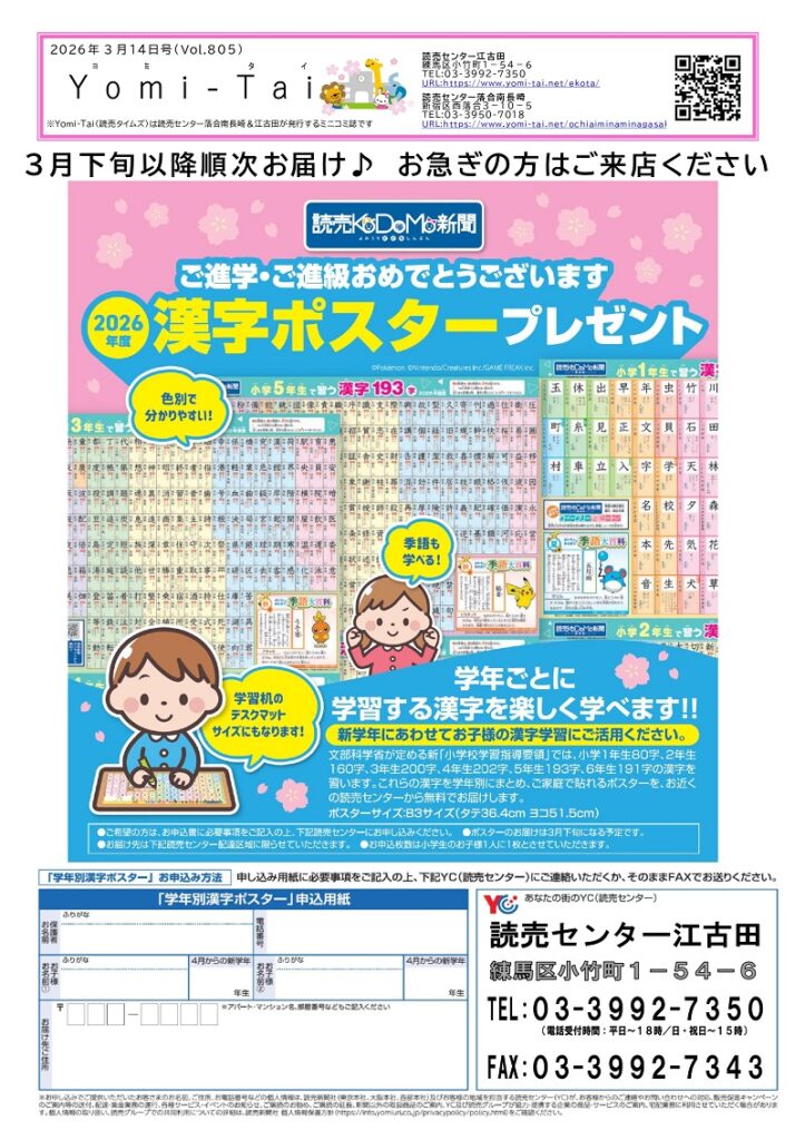 新聞のご購読のお申し込み・お問い合わせは、読売センター江古田へ