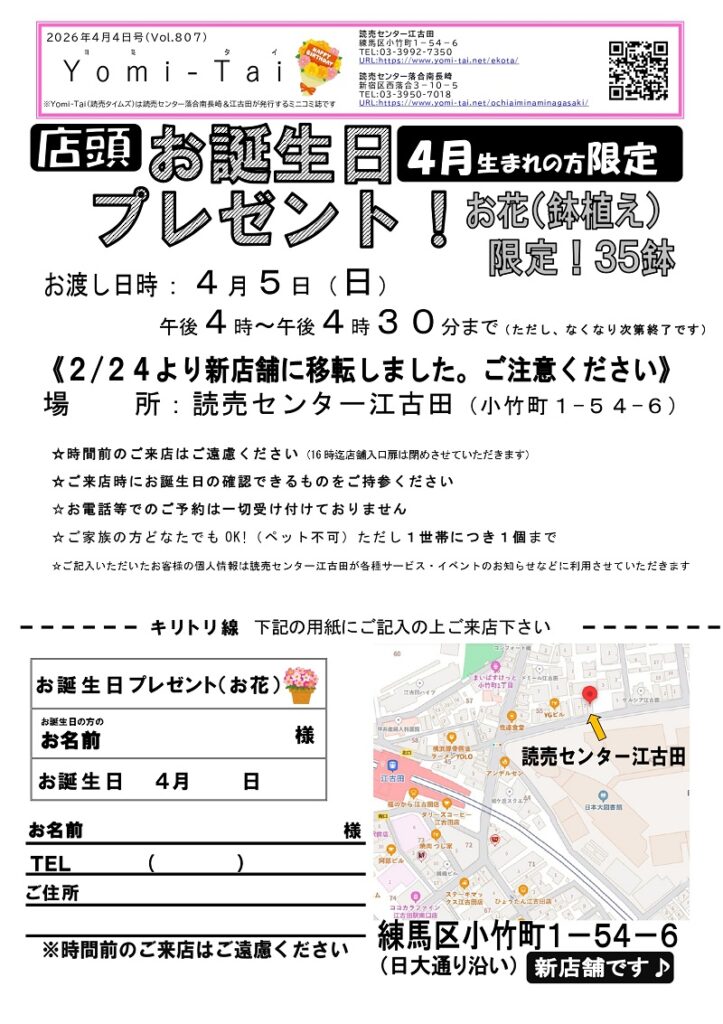 新聞のご購読のお申し込み・お問い合わせは、読売センター江古田へ