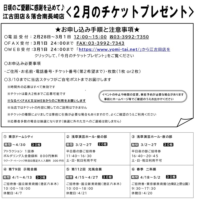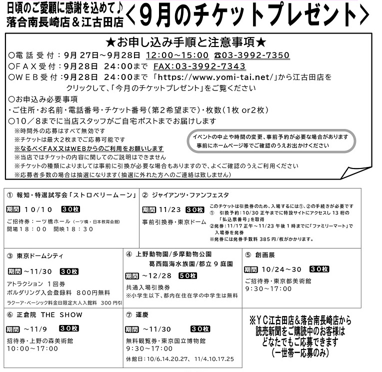 下記、チケットプレゼントはYC江古田で読売新聞ご購読中のお客様限定のサービスです。