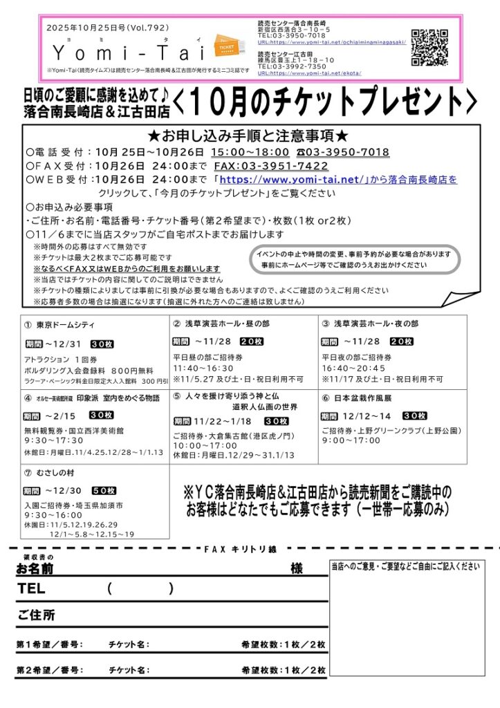新聞のご購読のお申し込み・お問い合わせは、読売センター落合南長崎へ
