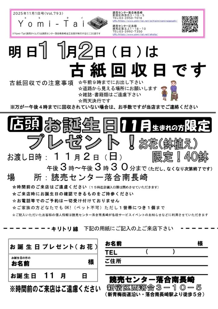新聞のご購読のお申し込み・お問い合わせは、読売センター落合南長崎へ