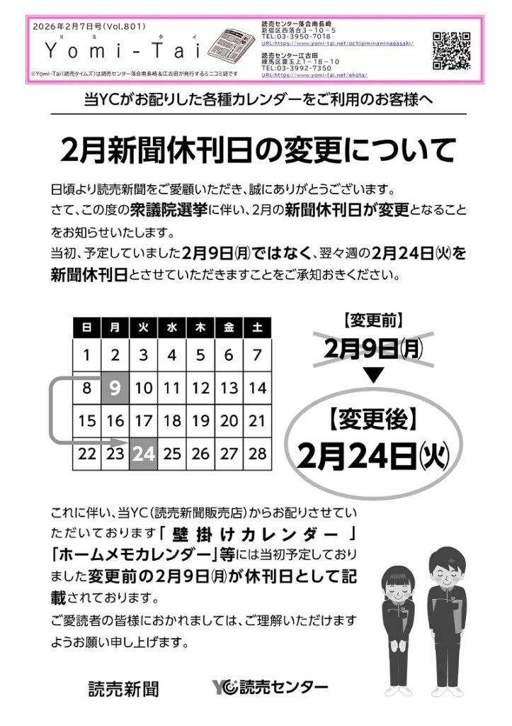 新聞のご購読のお申し込み・お問い合わせは、読売センター落合南長崎へ