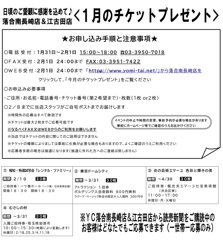 下記、チケットプレゼントはYC落合南長崎で読売新聞ご購読中のお客様限定のサービスです。