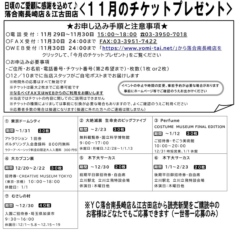 下記、チケットプレゼントはYC落合南長崎で読売新聞ご購読中のお客様限定のサービスです。